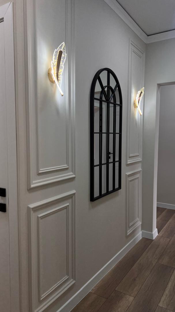— Просторная прихожая с молдингами, LED-подсветкой и настенными светильниками