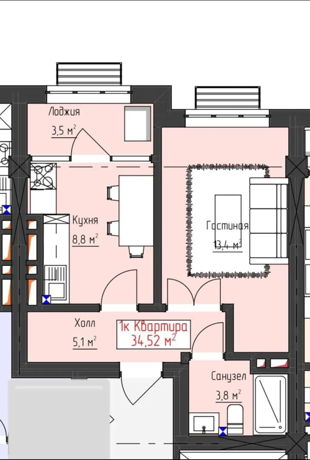Площадь 35м²